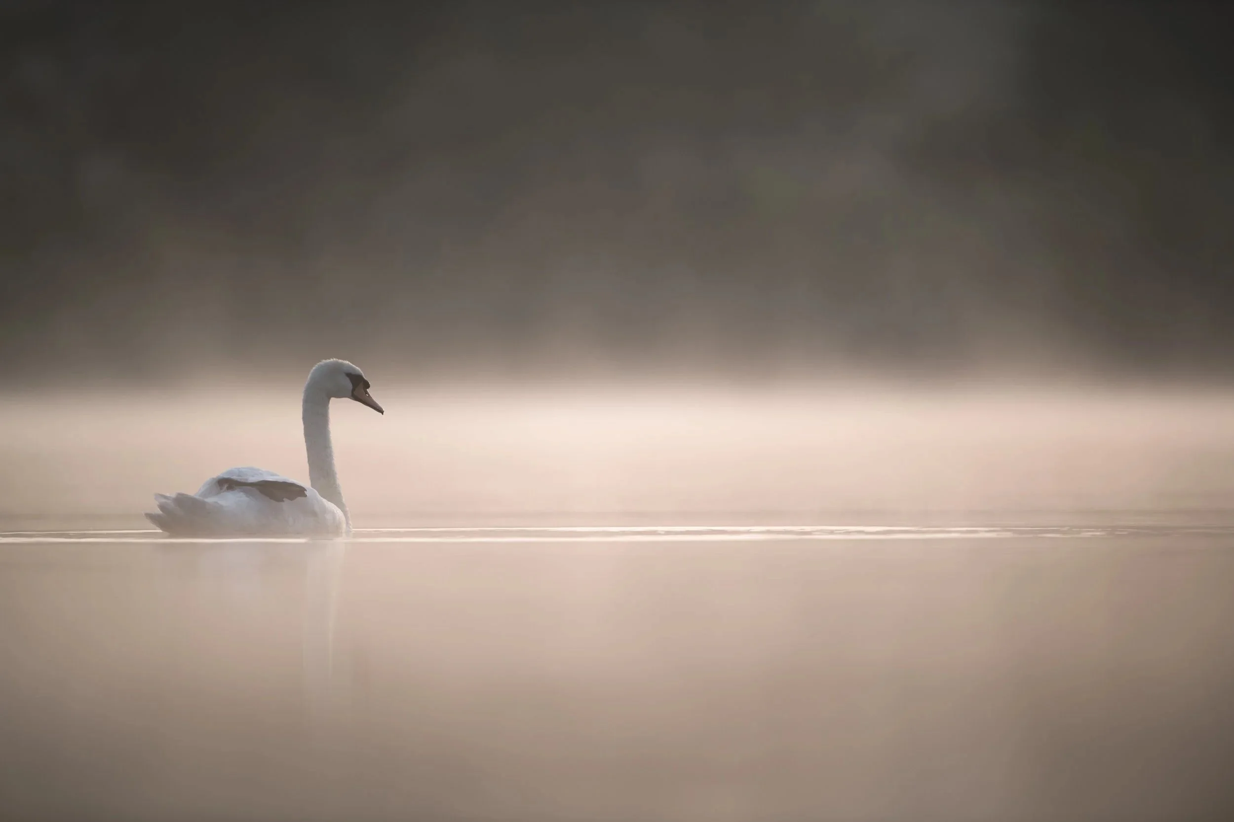 The lingering mist clings to the waters’ surface, framing this mute swan along the meadow.